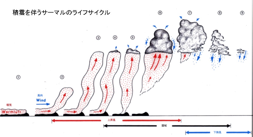 上昇気流には幾つかの種類がありますが、浜北滑空場でも最もよく発生する上昇気流はサーマルと呼ばれる「熱上昇気流」で、非常に一般的なものです。しかしエンジンなどの動力を持たないグライダーは常に下向きにしか飛行できないのに、何故上昇できるのでしょうか?